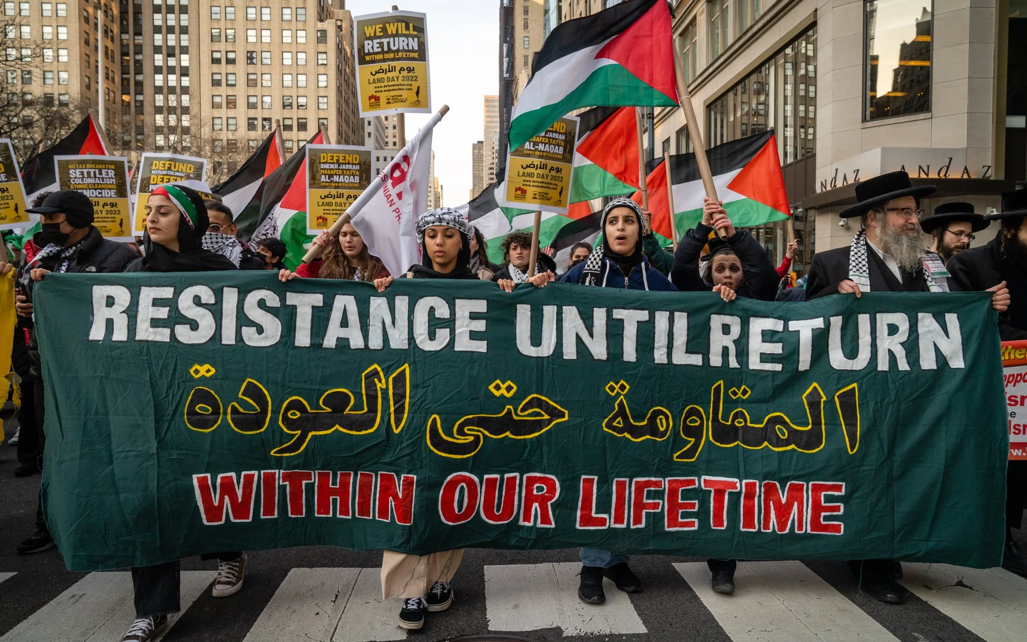 Pro-Palestinian protesters in New York, March 30, 2022. (Luke Tress/Times of Israel)